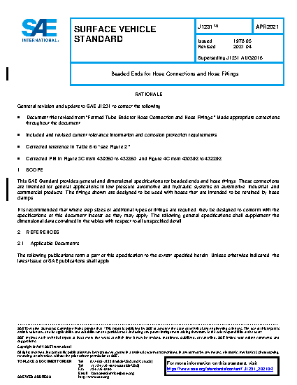 This SAE Standard provides general and dimensional specifications for beaded ends and hose fittings. These connections are intended for general applications in low pressure automotive and hydraulic systems on automotive, industrial, and commercial products. The fittings shown are designed to be used with hoses that are intended to be retained by hose clamps.
