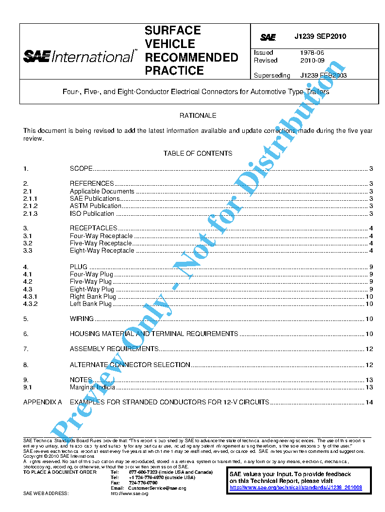 This SAE Recommended Practice covers the wiring and rectangularly shaped connector standards for all types of trailers whose gross weight does not exceed 4540 kg (10 000 lb). These trailers are grouped in SAE J684 with running light circuit loads not to exceed 7.5 A per circuit. This document provides circuits for lighting, electric brakes, trailer battery charging, and an auxiliary circuit color code and protection for the wiring from hazards or short circuits. Color code is compatible with SAE J560 and ISO 1724-1980(E).