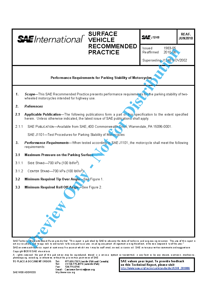 This SAE Recommended Practice presents performance requirements for the parking stability of two-wheeled motorcycles intended for highway use.