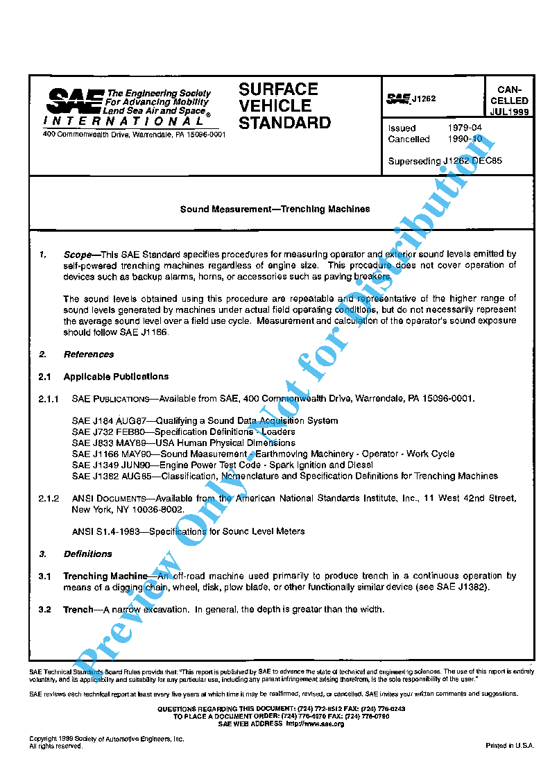 This SAE Standard specifies procedures for measuring operator and exterior sound levels emitted by self-powered trenching machines regardless of engine size. This procedure does not cover operation of devices such as backup alarms, horns, or accessories such as paving breakers. The sound levels obtained using this procedure are repeatable and representative of the higher range of sound levels generated by machines under actual field operating conditions, but do not necessarily represent the average sound level over a field use cycle. Measurement and calculation of the operator's sound exposure should follow SAE J1166.