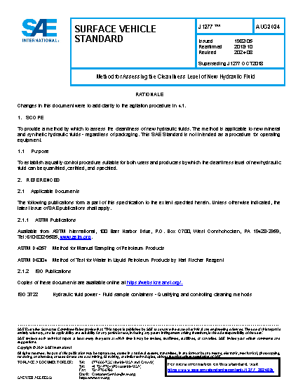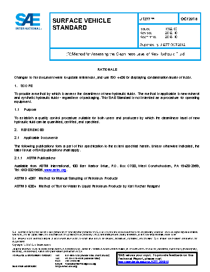 To provide a method by which to assess the cleanliness of new hydraulic fluids. The method is applicable to new mineral and synthetic hydraulic fluids - regardless of packaging. This SAE Standard is not intended as a procedure for operating equipment.