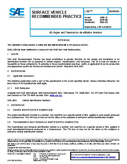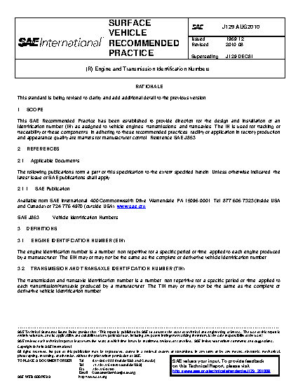 This SAE Recommended Practice has been established to provide direction for the design and installation of an identification number (IN) as assigned to vehicle engines, transmissions, and transaxles. The IN is used for tracking or traceability of these components. In adhering to these recommended practices, facility of application in factory production and appearance quality are matters for manufacturer control. Reference SAE J853.