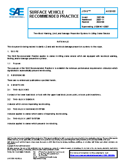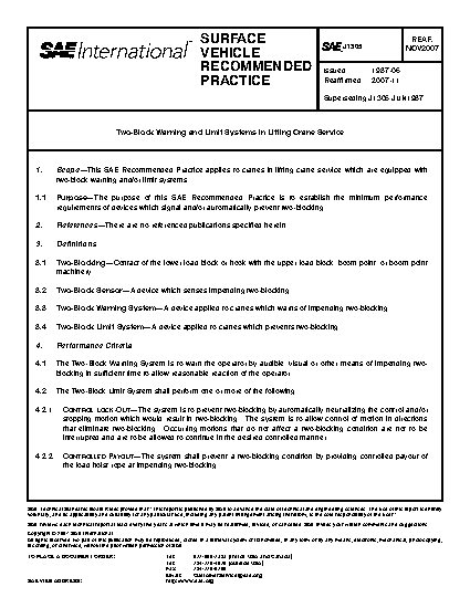 This SAE Recommended Practice applies to cranes in lifting crane service which are equipped with two-block warning, limiting, and/or damage prevention systems.
