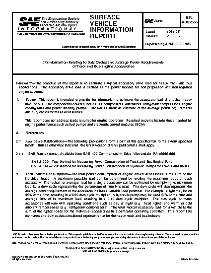 This report is intended to provide the information to estimate the accessory load of a typical heavy truck or bus. The components covered include: air compressors, alternators, refrigerant compressors, engine cooling fans and power steering pumps. The values show an estimate of the average power requirements and duty cycles for these accessories.
