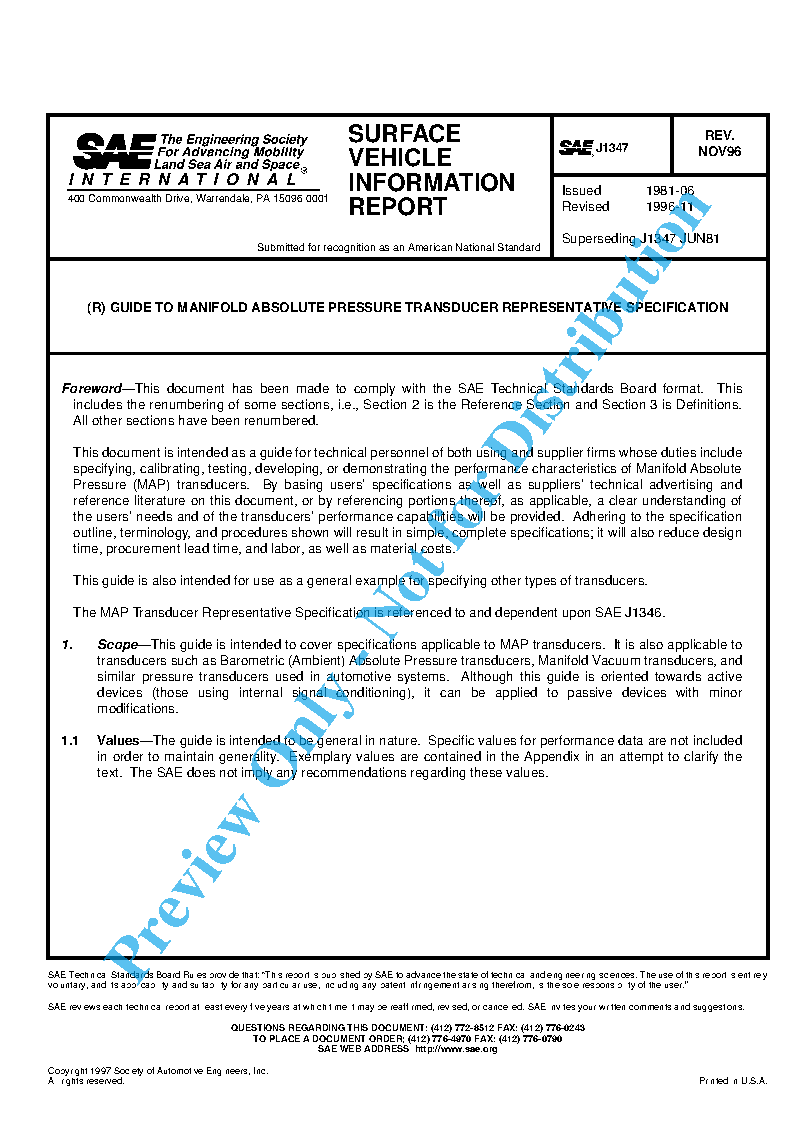 This guide is intended to cover specifications applicable to MAP transducers. It is also applicable to transducers such as Barometric (Ambient) Absolute Pressure transducers, Manifold Vacuum transducers, and similar pressure transducers used in automotive systems. Although this guide is oriented towards active devices (those using internal signal conditioning), it can be applied to passive devices with minor modifications.
