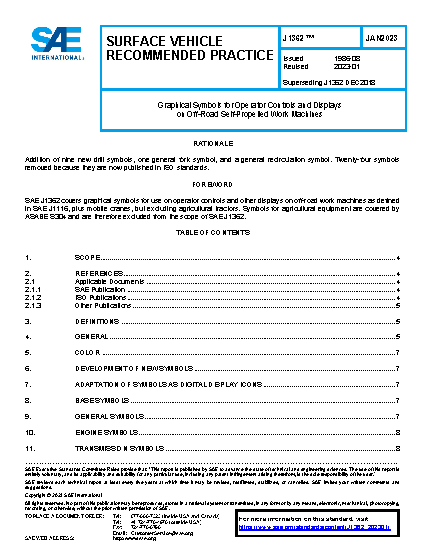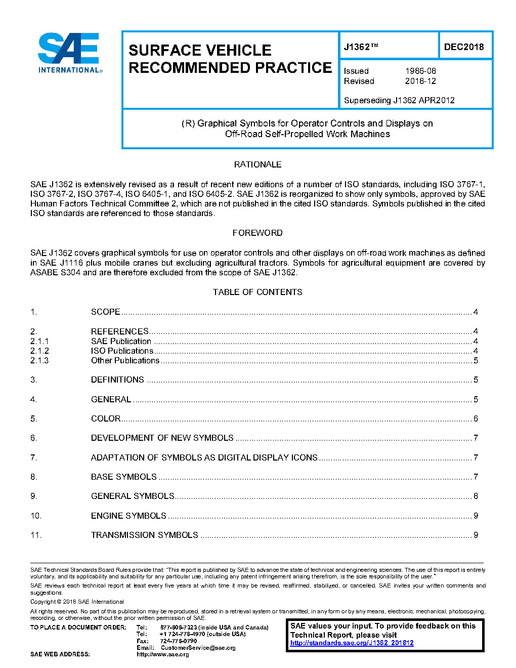 SAE J1362 presents graphical symbols for use on operator controls and other displays on off-road work machines as defined in SAE J1116, plus mobile cranes, but excluding agricultural tractors. Symbols for agricultural tractors are covered by ASABE S304, ISO 3767-1, and ISO 3767-2.