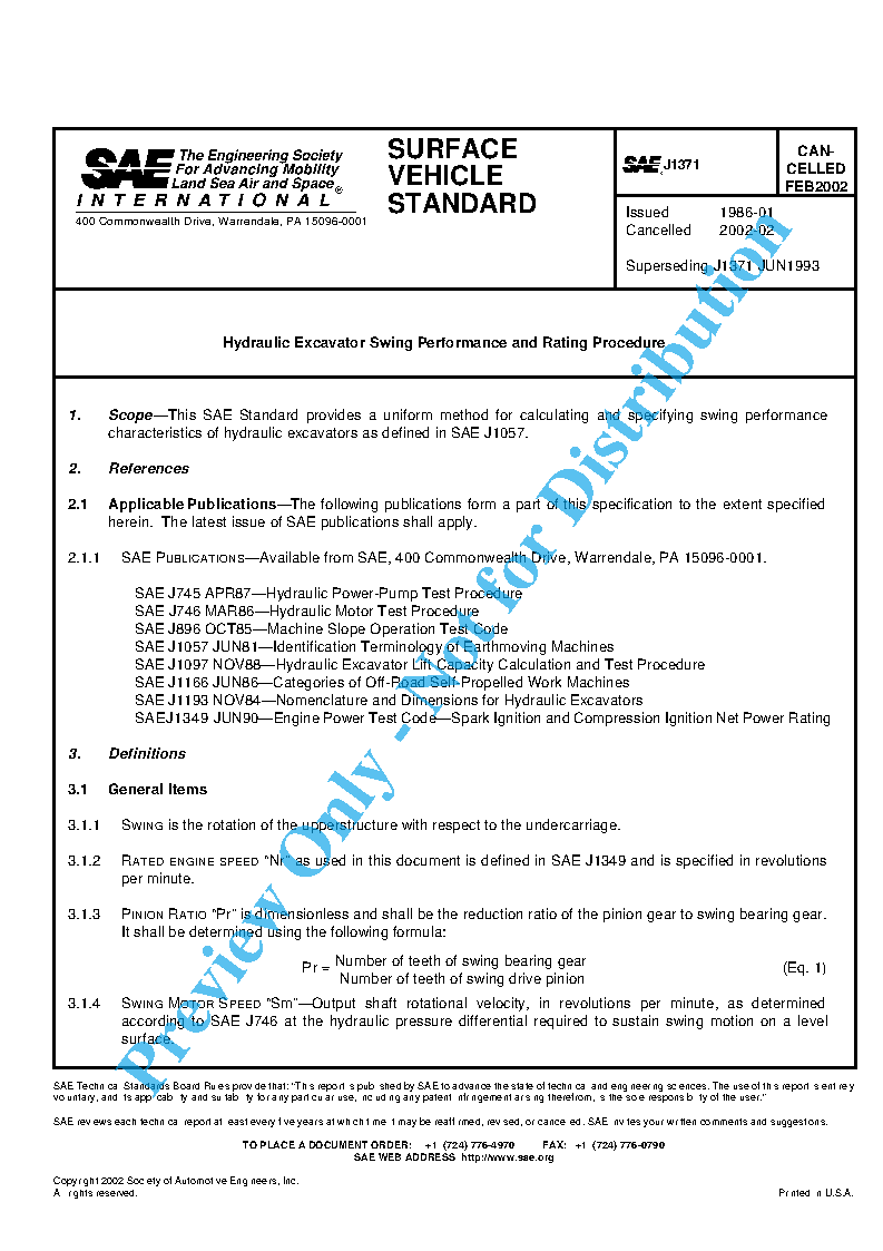 This SAE Standard provides a uniform method for calculating and specifying swing performance characteristics of hydraulic excavators as defined in SAE J1057.
