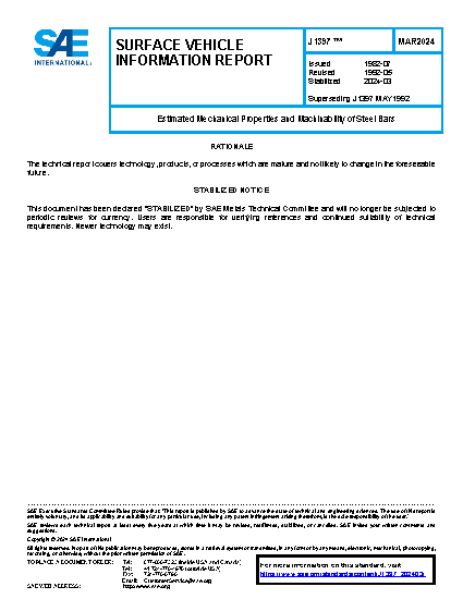 This SAE Information Report is intended to provide a guide to mechanical and machinability characteristics of some SAE steel grades. The ratings and properties shown are provided as general information and not as requirements for specifications unless each instance is approved by the source of supply. The data are based on resources which may no longer be totally accurate. However, this report is retained as a service in lieu of current data.