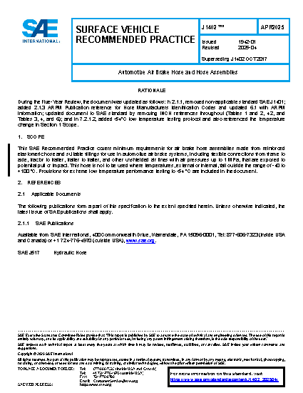 This SAE Recommended Practice covers minimum requirements for air brake hose assemblies made from reinforced elastomeric hose and suitable fittings for use in automotive air brake systems, including flexible connections from frame to axle, tractor to trailer, trailer to trailer, and other unshielded air lines with air pressures up to 1 MPa, that are exposed to potential pull or impact. This hose is not to be used where temperatures, external or internal, fall outside the range of -40 to +100 °C. Provisions for extreme low temperature performance testing to -54 °C are included in the document.