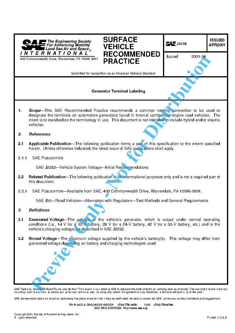 This SAE Recommended Practice recommends a common naming convention to be used to designate the terminals on automotive generators found in internal combustion engine road vehicles. The intent is to standardize the terminology in use. This document is not intended to include hybrid and/or electric vehicles.