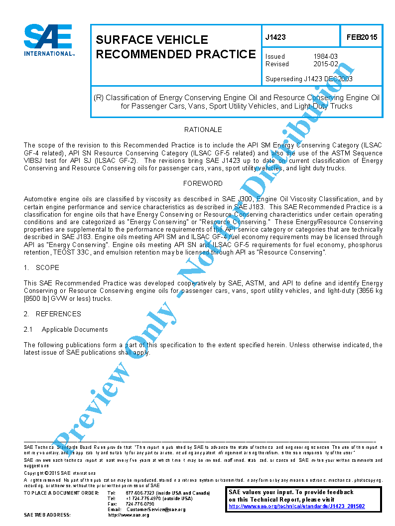 This SAE Recommended Practice was developed cooperatively by SAE, ASTM, and API to define and identify energy conserving or resource conserving engine oils for passenger cars, vans, sport utility vehicles, and light-duty (3856 kg [8500 pounds] GVW or less) trucks.