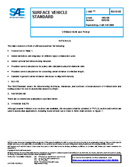 This SAE Standard covers the dimensioning technique, tolerances, and methods of measurement of V-ribbed belts and mating pulleys for use on automotive accessory drives.