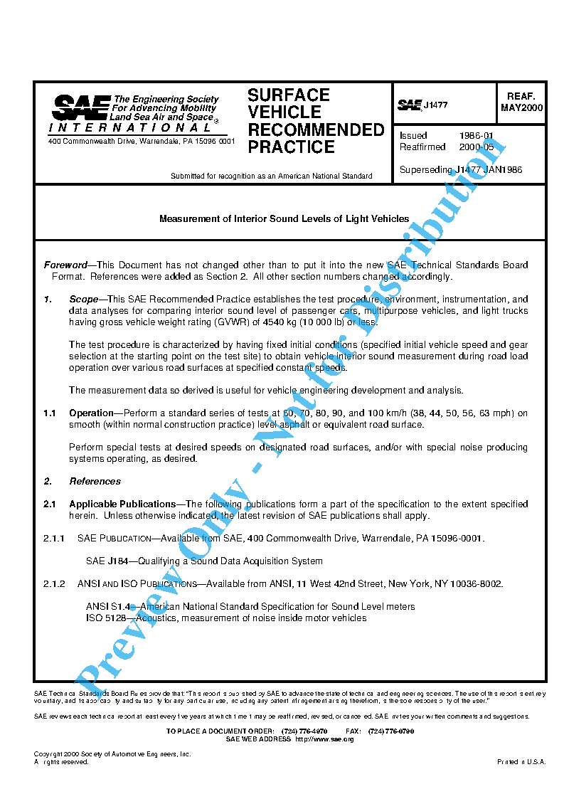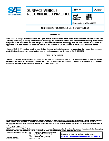 This SAE Recommended Practice establishes the test procedure, environment, instrumentation, and data analyses for comparing interior sound level of passenger cars, multipurpose vehicles, and light trucks having gross vehicle weight rating (GVWR) of 4540 kg (10 000 lb) or less.