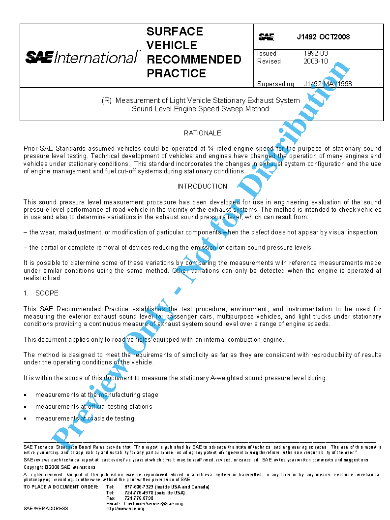 This SAE Recommended Practice establishes the test procedure, environment, and instrumentation to be used for measuring the exterior exhaust sound level for passenger cars, multipurpose vehicles, and light trucks under stationary conditions providing a continuous measure of exhaust system sound level over a range of engine speeds.