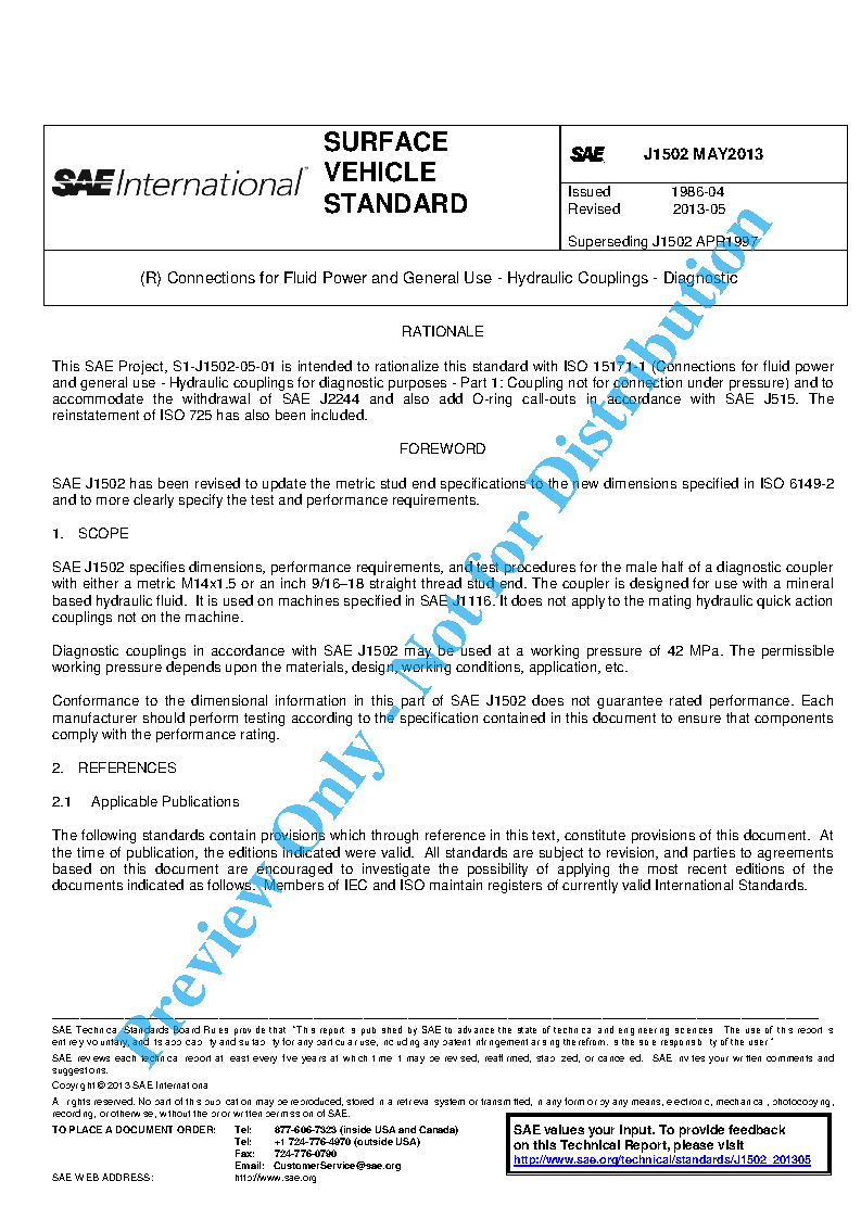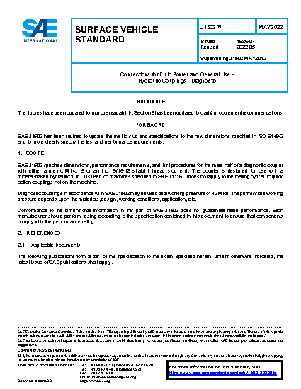 SAE J1502 specifies dimensions, performance requirements, and test procedures for the male half of a diagnostic coupler with either a metric M14×1.5 or an inch 9/16-18 straight thread stud end. The coupler is designed for use with a mineral based hydraulic fluid. It is used on machines specified in SAE J1116. It does not apply to the mating hydraulic quick action couplings not on the machine.