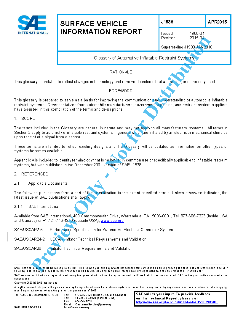 Appendix A is included to identify terminology that is no longer in common use or specifically applicable to inflatable restraint systems, but was published in the December 2001 version of SAE J1538.
