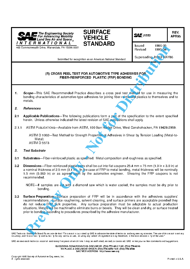 This SAE Recommended Practice describes a cross peel test method for use in measuring the bonding characteristics of automotive-type adhesives for joining fiber-reinforced plastics to themselves and to metals.