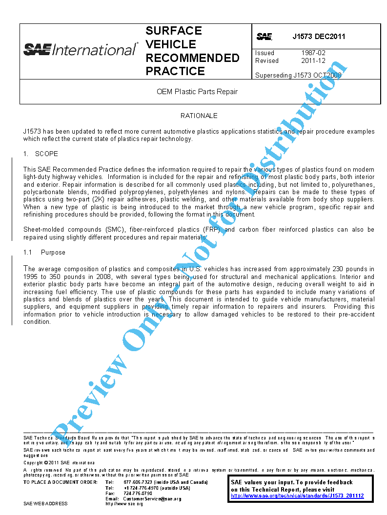 This SAE Recommended Practice defines the information required to repair the various types of plastics found on modern light-duty highway vehicles. Information is included for the repair and refinishing of most plastic body parts, both interior and exterior. Repair information is described for all commonly used plastics including, but not limited to, polyurethanes, polycarbonate blends, modified polypropylenes, polyethylenes and nylons. Repairs can be made to these types of plastics using two-part (2K) repair adhesives, plastic welding, and other materials available from body shop suppliers. When a new type of plastic is being introduced to the market through a new vehicle program, specific repair and refinishing procedures should be provided, following the format in this document.
