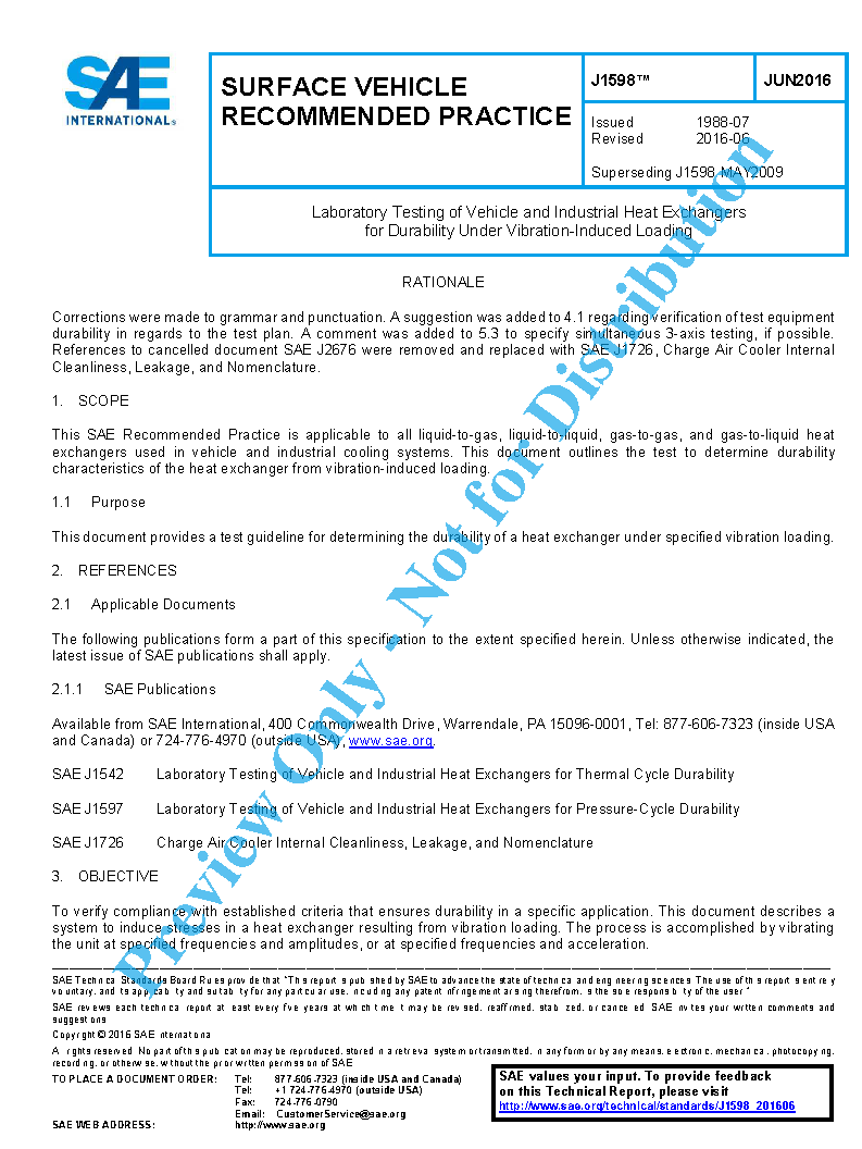 This SAE Recommended Practice is applicable to all liquid-to-gas, liquid-to-liquid, gas-to-gas, and gas-to-liquid heat exchangers used in vehicle and industrial cooling systems. This document outlines the test to determine durability characteristics of the heat exchanger from vibration-induced loading.