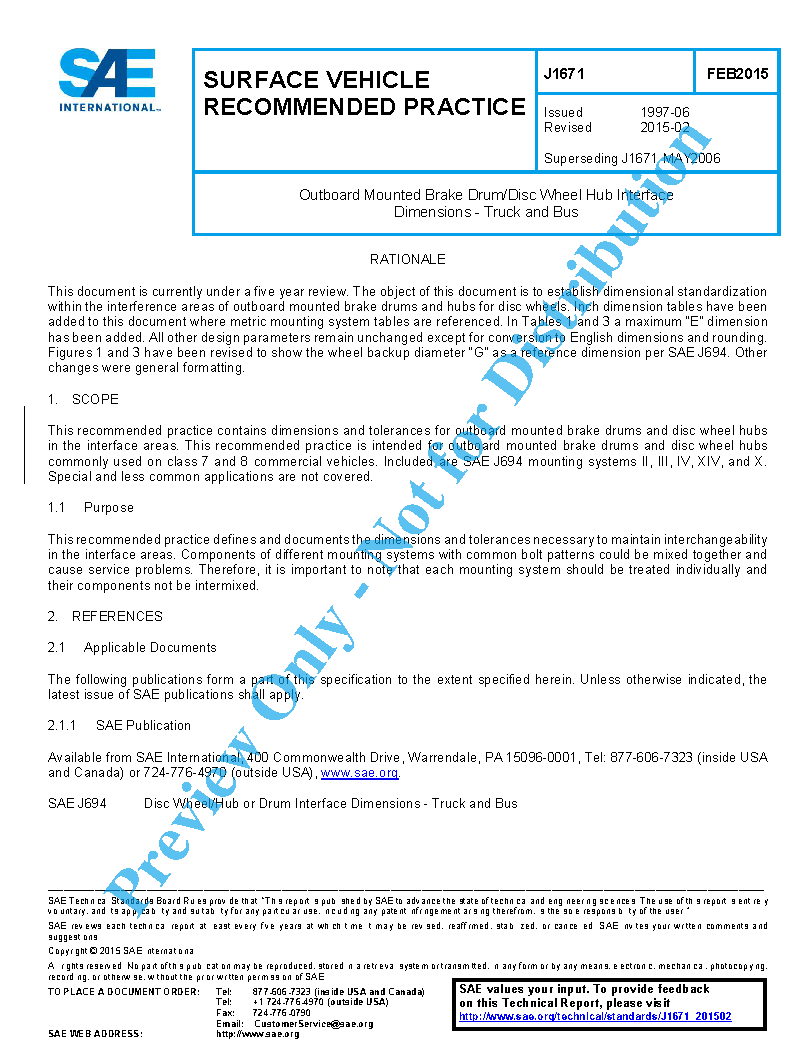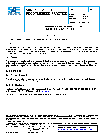 This recommended practice contains dimensions and tolerances for outboard mounted brake drums and disc wheel hubs in the interface areas. This recommended practice is intended for outboard mounted brake drums and disc wheel hubs commonly used on class 7 and 8 commercial vehicles. Included are SAE J694 mounting systems II, III, IV, XIV, and X. Special and less common applications are not covered.