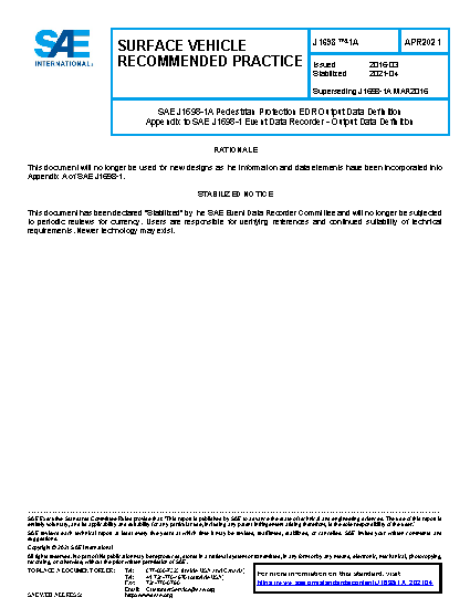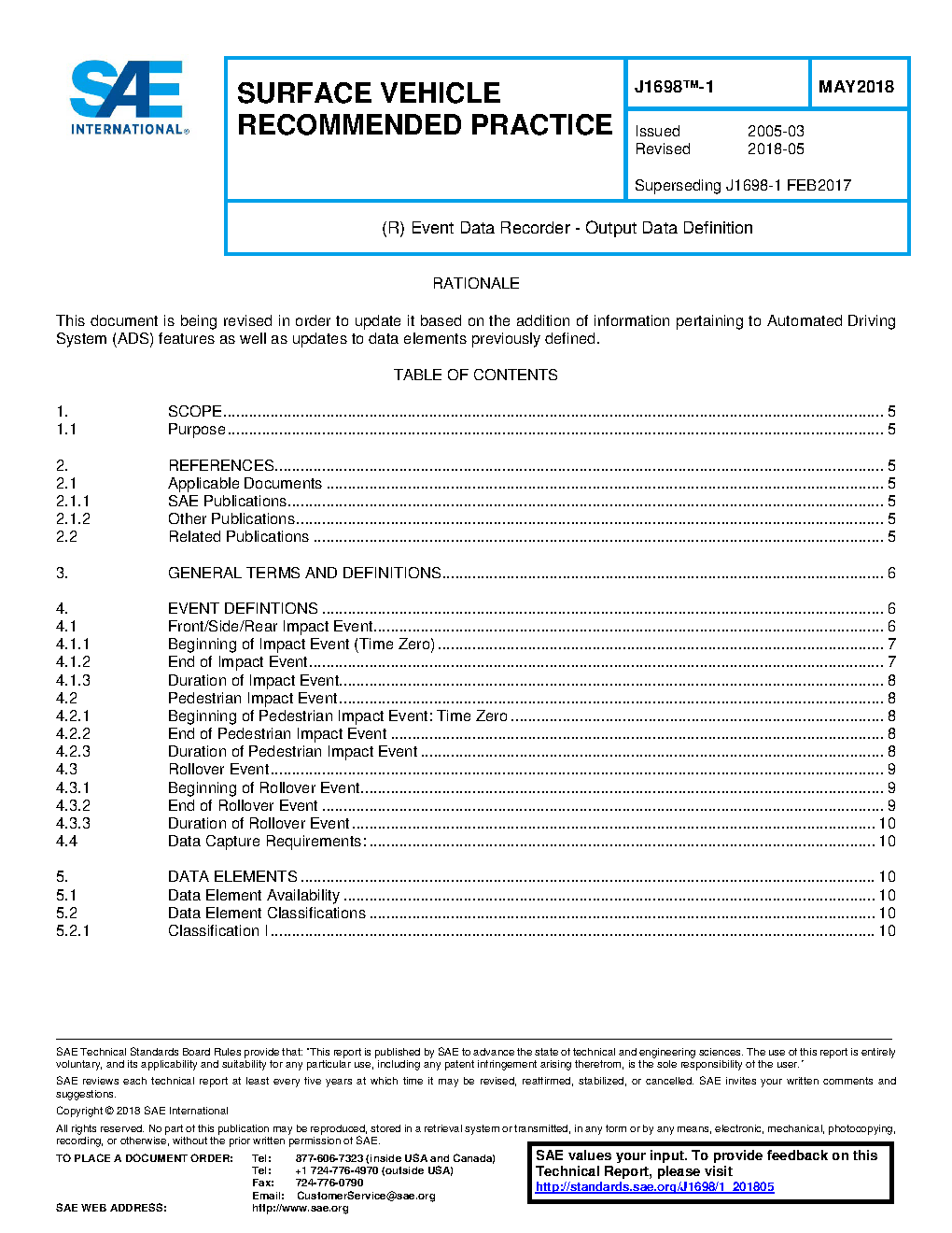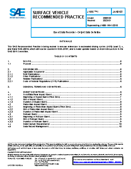 This SAE Recommended Practice provides common data output formats and definitions for a variety of data elements that may be useful for analyzing vehicle crash and crash-like events that meet specified trigger criteria. The document is intended to govern data element definitions, to provide a minimum data element set, and to specify EDR record format as applicable for light-duty motor vehicle Original Equipment applications.