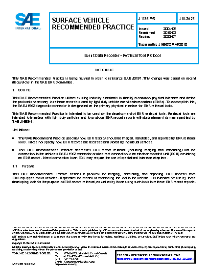 This SAE Recommended Practice is intended to be used for the development of EDR retrieval tools. Retrieval tools are intended to interface with light duty vehicles and to produce EDR record reports with data element formats specified by SAE J1698-1.