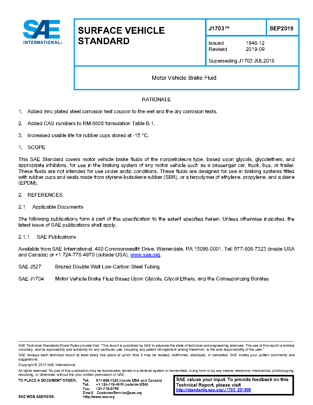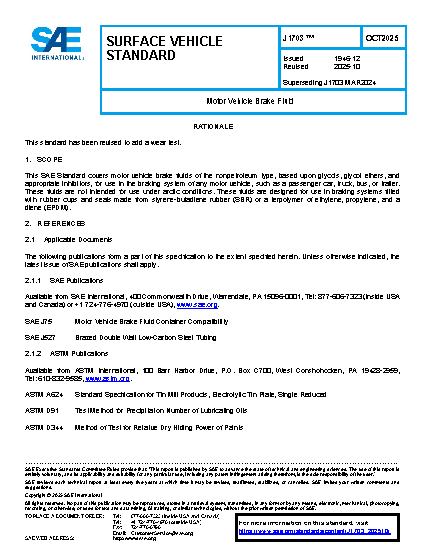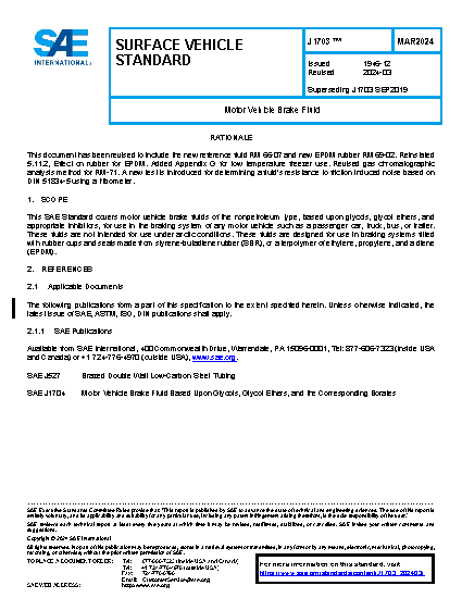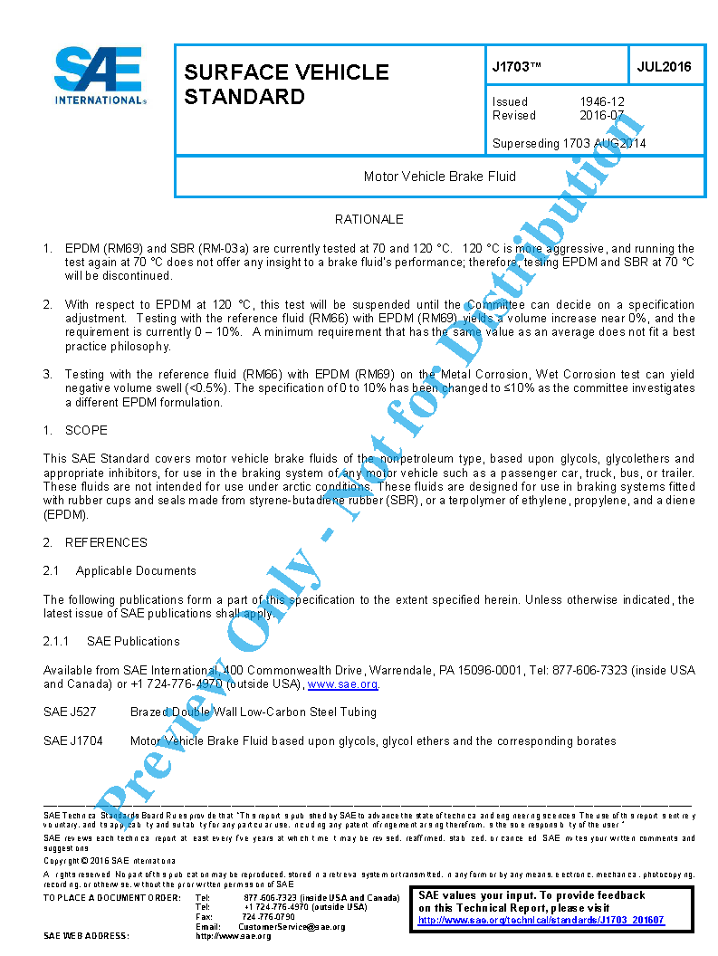 This SAE Standard covers motor vehicle brake fluids of the nonpetroleum type, based upon glycols, glycol ethers, and appropriate inhibitors, for use in the braking system of any motor vehicle, such as a passenger car, truck, bus, or trailer. These fluids are not intended for use under arctic conditions. These fluids are designed for use in braking systems fitted with rubber cups and seals made from styrene-butadiene rubber (SBR) or a terpolymer of ethylene, propylene, and a diene (EPDM).