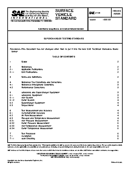 This test document is applicable to all superchargers not requiring fuel to be added to the inlet air prior to the supercharger. This SAE Standard only applies to bench testing. Any maximum speed, temperature, and pressure ratios supplied by the manufacturer should be for this use only and may not apply to applications of firing engines. This document has been adopted by SAE to specify: