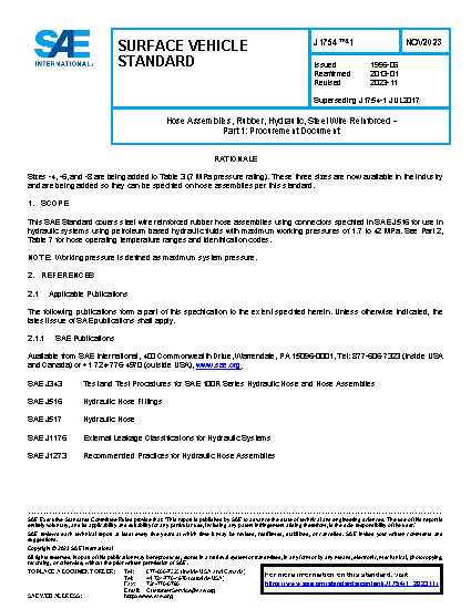 This SAE Standard covers steel wire reinforced rubber hose assemblies using connectors specified in SAE J516 for use in hydraulic systems using petroleum based hydraulic fluids with maximum working pressures of 1.7 to 42 MPa. See Part 2, Table 7 for hose operating temperature ranges and identification codes.