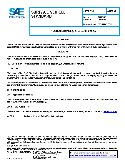 The scope of this SAE Standard is to provide methods to determine display optical performance in all typical automotive ambient light illumination - with focus on High Ambient Contrast Ratio, which is critical for display legibility in a sunshine environment. It covers indoor measurements and simulated outdoor lighting.