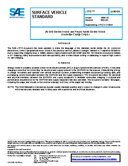 This SAE Standard covers the general physical, electrical, functional and performance requirements to facilitate conductive charging of EV/PHEV vehicles in North America. This document defines a common EV/PHEV and supply equipment vehicle conductive charging method including operational requirements and the functional and dimensional requirements for the vehicle inlet and mating connector.