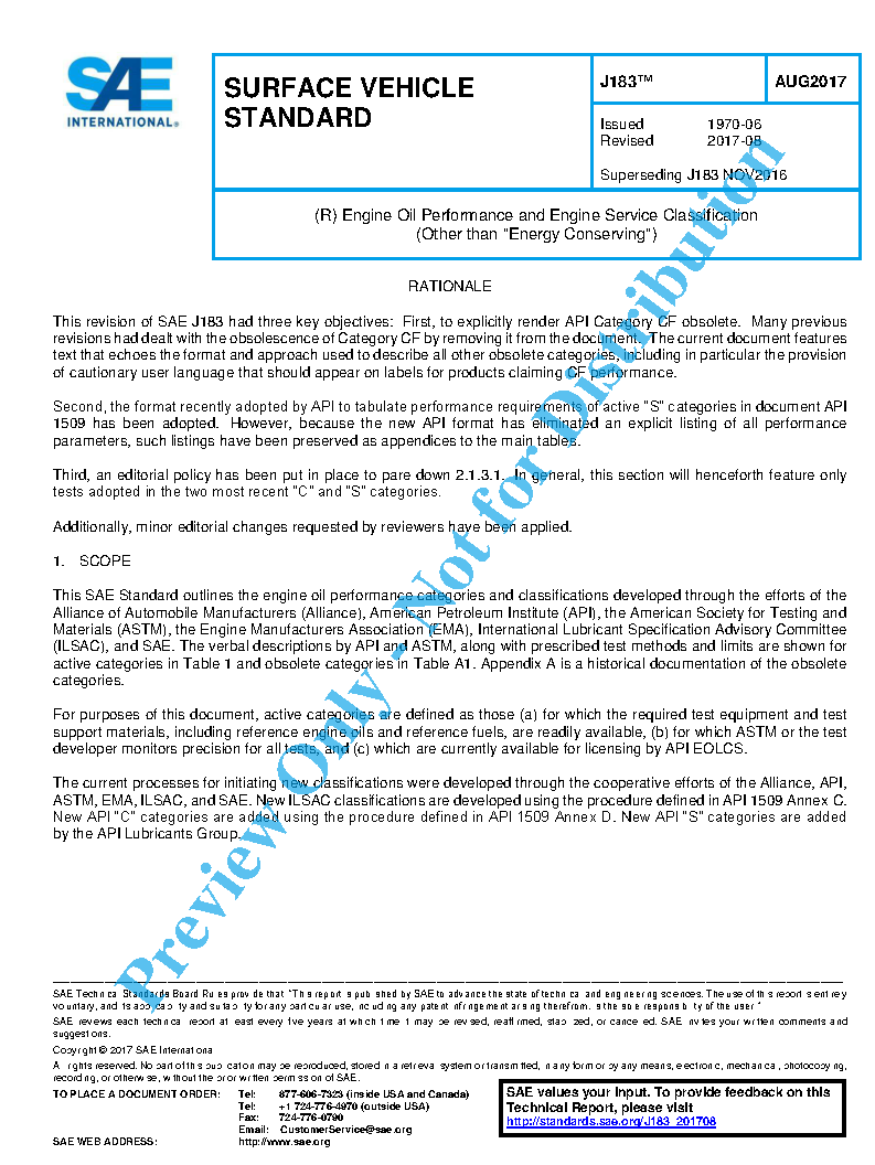 This SAE Standard outlines the engine oil performance categories and classifications developed through the efforts of the Alliance of Automobile Manufacturers (Alliance), American Petroleum Institute (API), the American Society for Testing and Materials (ASTM), the Engine Manufacturers Association (EMA), the International Lubricant Specification Advisory Committee (ILSAC), and SAE. The verbal descriptions by API and ASTM, along with prescribed test methods and limits, are shown for active categories in Table 1 and obsolete categories in Table A1. Appendix A is thus a historical documentation of the obsolete categories.
