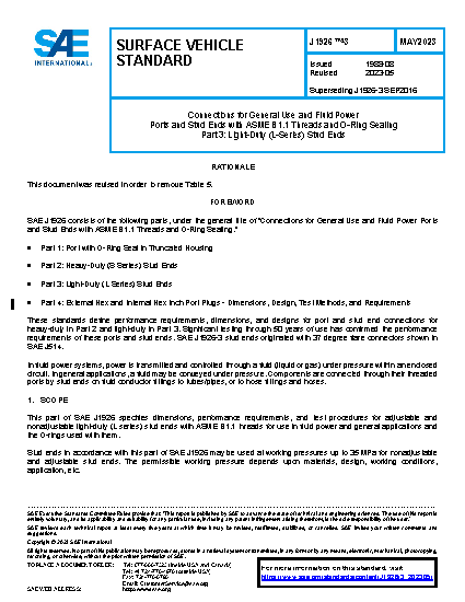 This part of SAE J1926 specifies dimensions, performance requirements, and test procedures for adjustable and nonadjustable light-duty (L series) stud ends with ASME B1.1 threads for use in fluid power and general applications and the O-rings used with them.