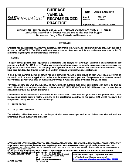 This part defines performance requirements, dimensions, and designs for -2 through -32 internal and external hex port plugs for use in SAE J1926-1 ports. Testing and usage through many years confirm the performance requirements of port plugs made from carbon steel. The port plugs were specified in SAE J514 without any performance requirements. They have been developed and tested to gain a 4:1 working pressure rating for industrial applications.