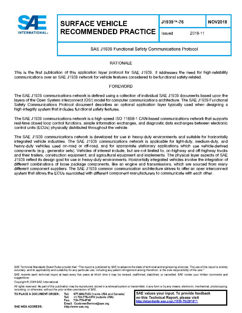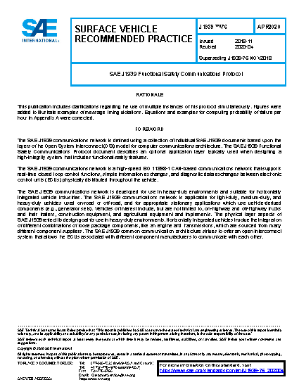 This document provides the technical requirements for implementing the SAE J1939 Functional Safety Communication Protocol in a manner determined suitable for meeting industry applicable functional safety standards.