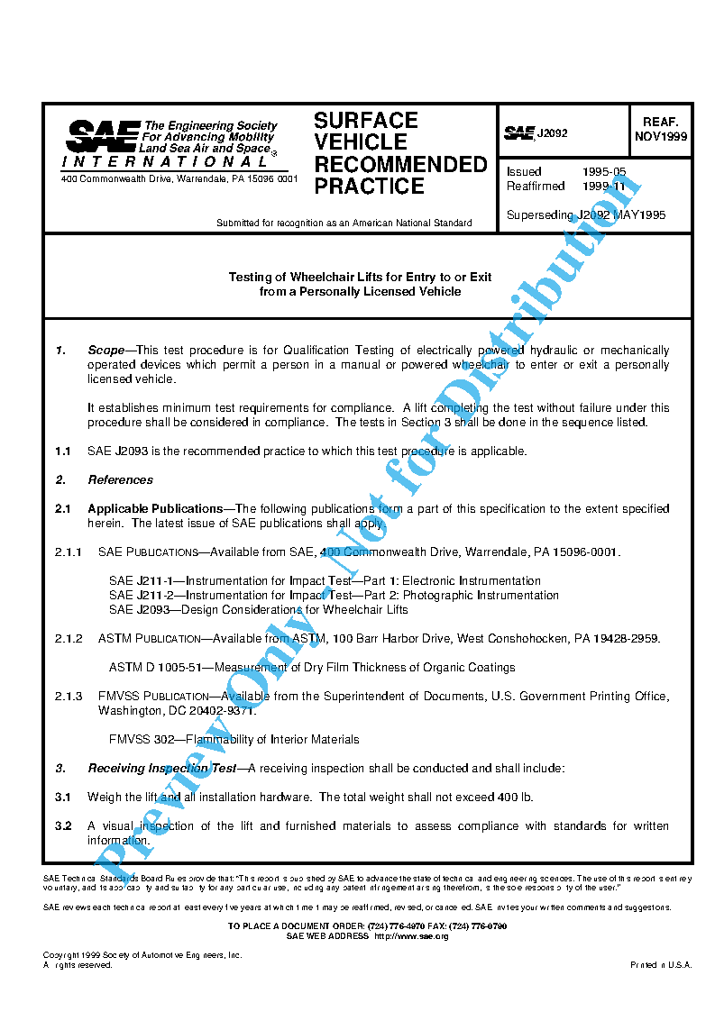 This test procedure is for Qualification Testing of electrically powered hydraulic or mechanically operated devices which permit a person in a manual or powered wheelchair to enter or exit a personally licensed vehicle.