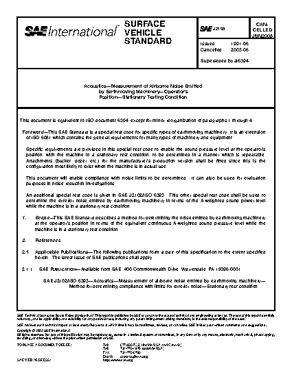 This SAE Standard describes a method for determining the noise emitted by earthmoving machinery at the operator's position in terms of the equivalent continuous A-weighted sound pressure level while the machine is in a stationary test condition.