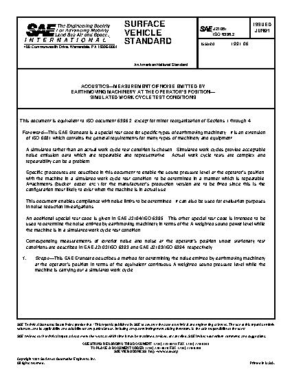 This SAE Standard describes a method for determining the noise emitted by earthmoving machinery at the operator’s position in terms of the equivalent continuous A-weighted sound pressure level while the machine is carrying out a simulated work cycle.