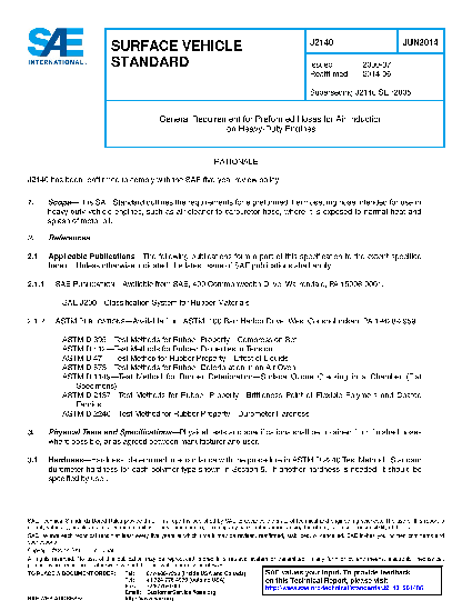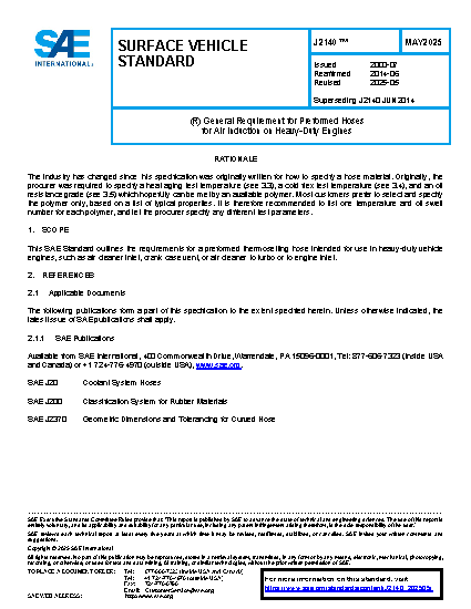 This SAE Standard outlines the requirements for a preformed thermosetting hose intended for use in heavy-duty vehicle engines, such as air cleaner inlet, crank case vent, or air cleaner to turbo or to engine inlet.