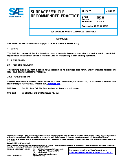 This SAE Recommended Practice describes chemical analysis, hardness, microstructure, and physical characteristic requirements for low carbon cast steel shot to be used for shot peening or blast cleaning operations.