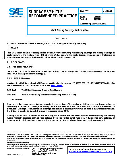 This SAE recommended practice provides some procedure for determining shot peening coverage and relating coverage to part exposure to the media stream. Effectiveness of shot peening is directly dependent on coverage. Either incomplete or excessive coverage can be detrimental to fatigue strength and life.