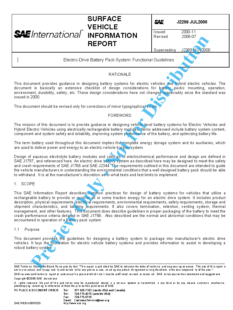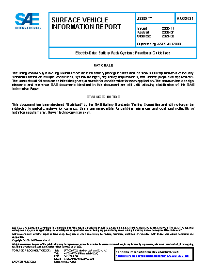 This SAE Information Report describes common practices for design of battery systems for vehicles that utilize a rechargeable battery to provide or recover all or some traction energy for an electric drive system. It includes product description, physical requirements, electrical requirements, environmental requirements, safety requirements, storage and shipment characteristics, and labeling requirements. It also covers termination, retention, venting system, thermal management, and other features. This document does describe guidelines in proper packaging of the battery to meet the crash performance criteria detailed in SAE J1766. Also described are the normal and abnormal conditions that may be encountered in operation of a battery pack system