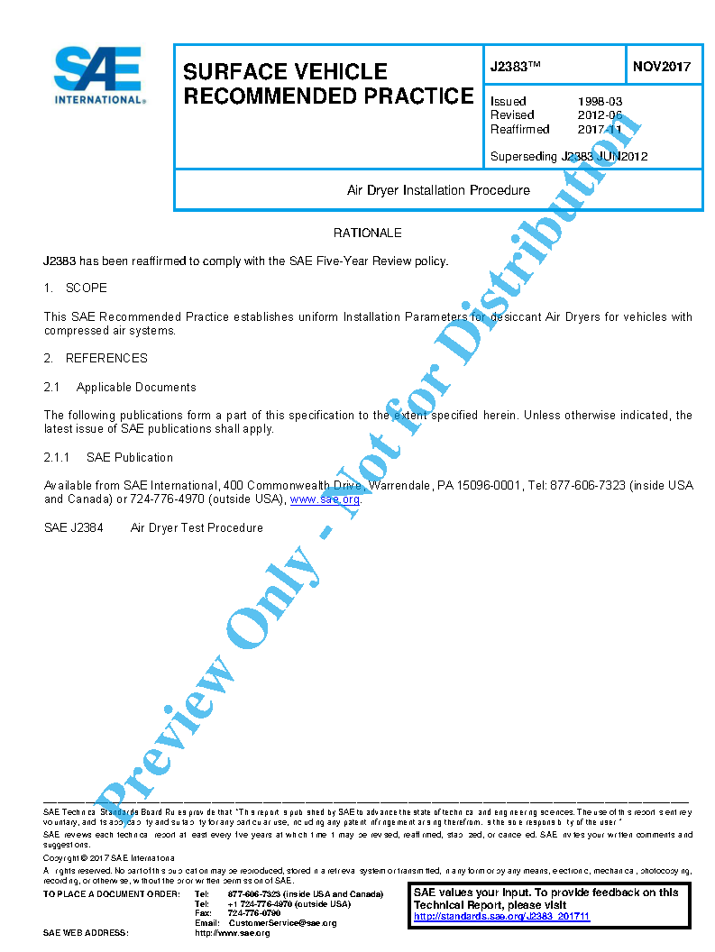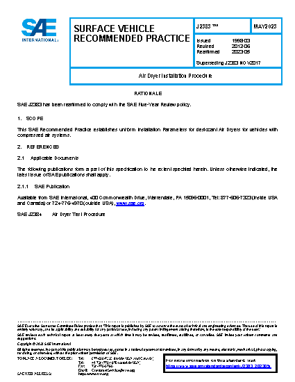 This SAE Recommended Practice establishes uniform Installation Parameters for desiccant Air Dryers for vehicles with compressed air systems.