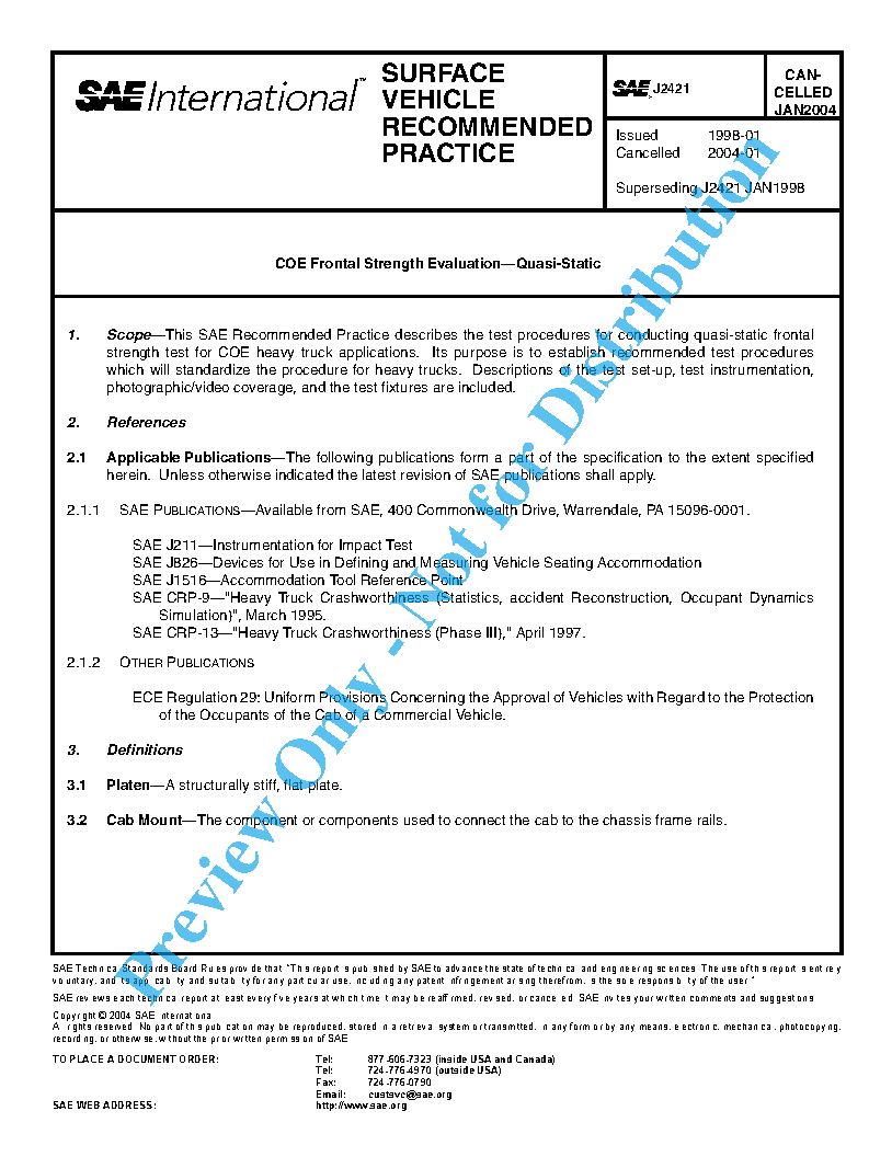 This SAE Recommended Practice describes the test procedures for conducting quasi-static frontal strength test for COE heavy truck applications. Its purpose is to establish recommended test procedures which will standardize the procedure for heavy trucks. Descriptions of the test set-up, test instrumentation, photographic/video coverage, and the test fixtures are included.