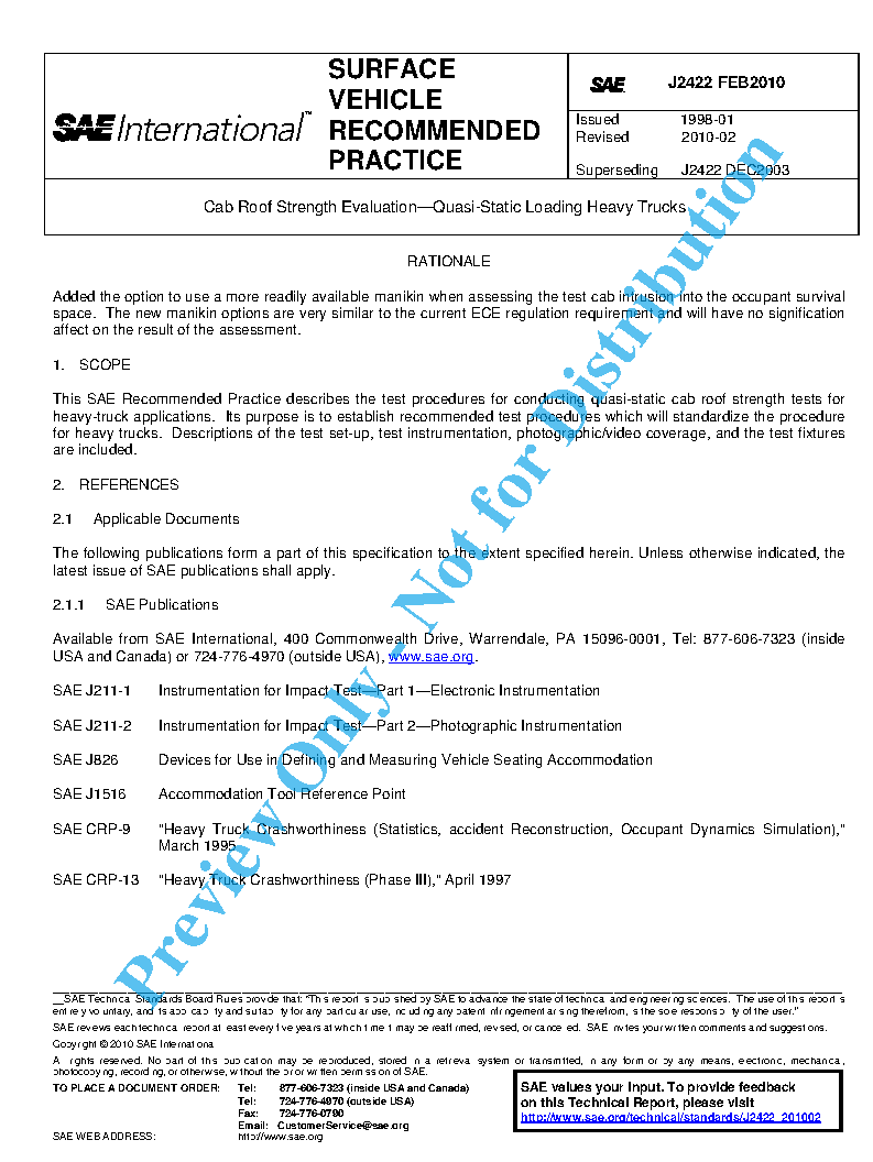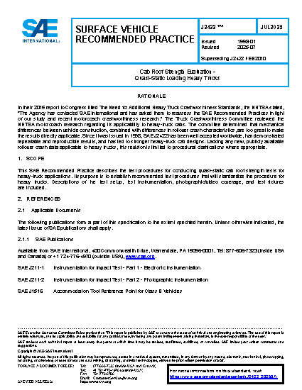 This SAE Recommended Practice describes the test procedures for conducting quasi-static cab roof strength tests for heavy-truck applications. Its purpose is to establish recommended test procedures which will standardize the procedure for heavy trucks. Descriptions of the test set-up, test instrumentation, photographic/video coverage, and the test fixtures are included.