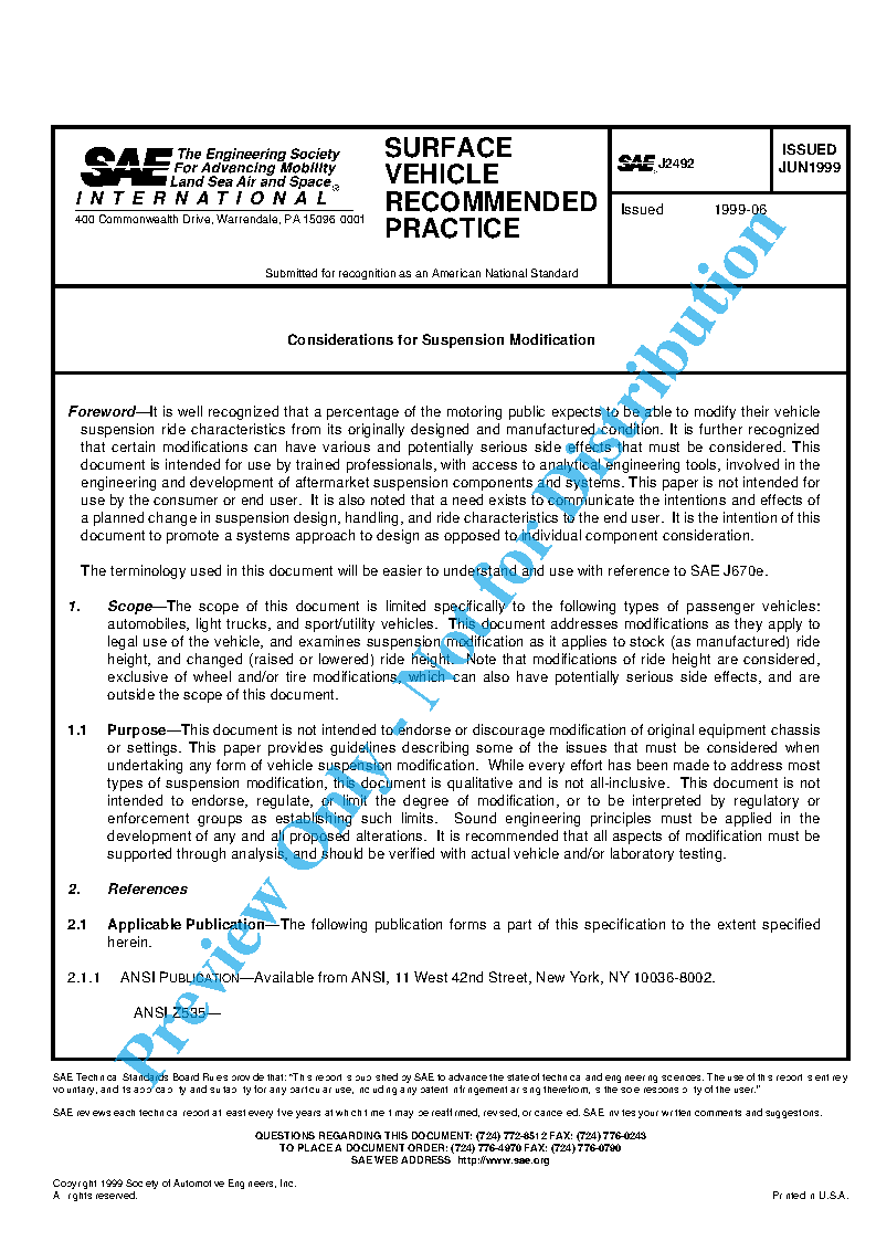 The scope of this document is limited specifically to the following types of passenger vehicles: automobiles, light trucks, and sport/utility vehicles. This document addresses modifications as they apply to legal use of the vehicle, and examines suspension modification as it applies to stock (as manufactured) ride height, and changed (raised or lowered) ride height. Note that modifications of ride height are considered, exclusive of wheel and/or tire modifications, which can also have potentially serious side effects, and are outside the scope of this document.