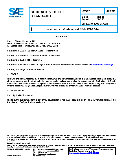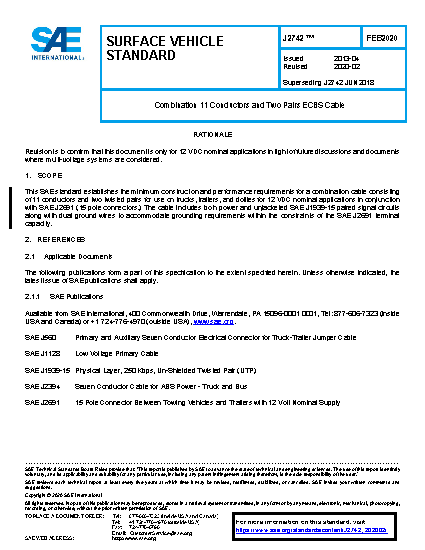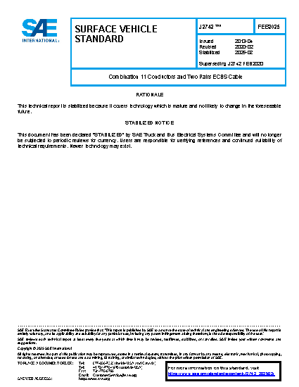 This SAE standard establishes the minimum construction and performance requirements for a combination cable consisting of 11 conductors and two twisted pairs for use on trucks, trailers, and dollies for 12 VDC nominal applications in conjunction with SAE J2691 (15 pole connectors.) The cable includes both power and unjacketed SAE J1939-15 paired signal circuits along with dual ground wires to accommodate grounding requirements within the constraints of the SAE J2691 terminal capacity.