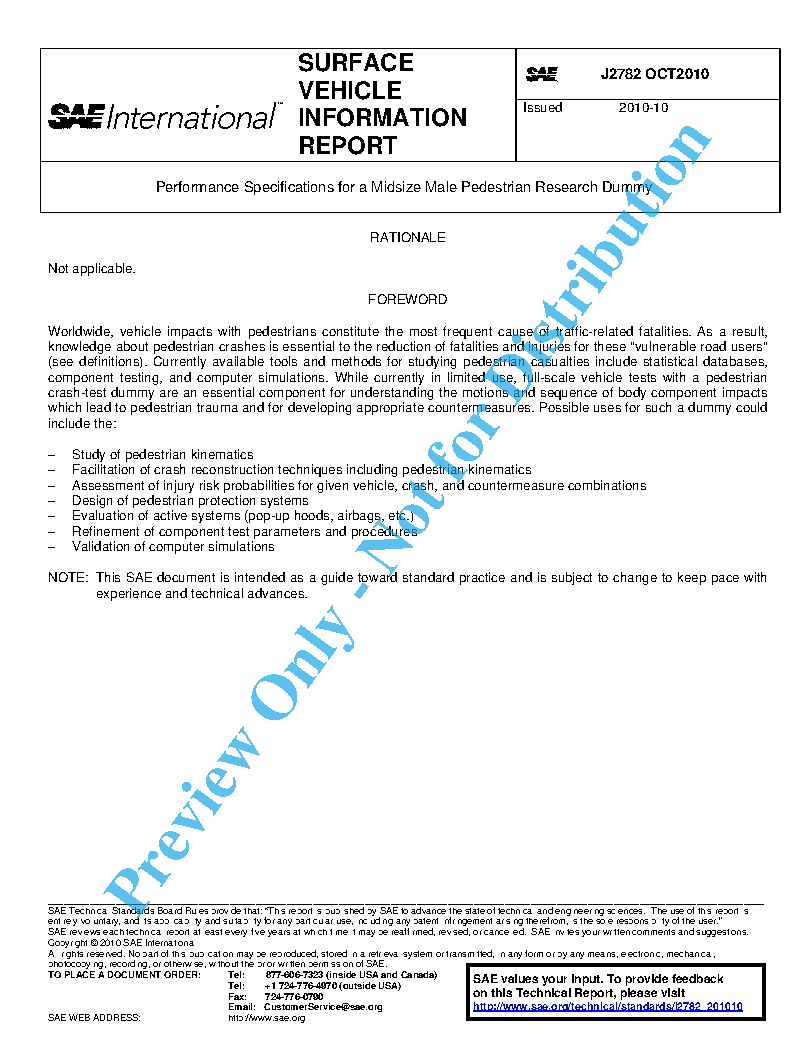 While it is recognized that collisions involve pedestrians of all sizes, this Information Report addresses performance specifications for a midsize adult male research dummy. This approach stems from the greater knowledge of biomechanics and existing dummy technologies for the midsize male relative to other adult sizes and children. While not the initial objective, it is envisioned that additional performance specifications for other sizes of pedestrian research dummies will be developed in the future based on accepted scaling procedures.