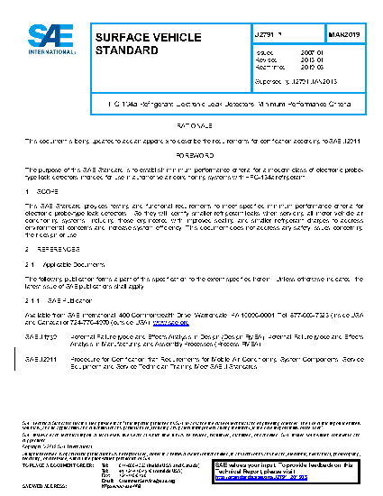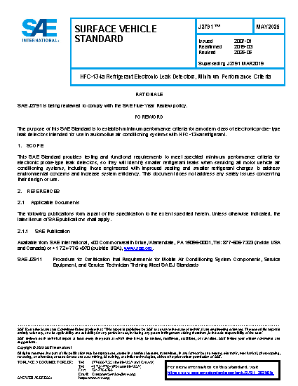 This SAE Standard provides testing and functional requirements to meet specified minimum performance criteria for electronic probe-type leak detectors, so they will identify smaller refrigerant leaks when servicing all motor vehicle air conditioning systems, including those engineered with improved sealing and smaller refrigerant charges to address environmental concerns and increase system efficiency. This document does not address any safety issues concerning their design or use.