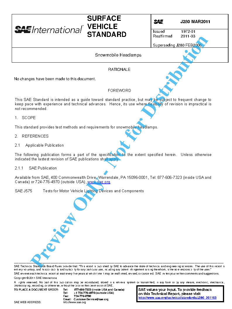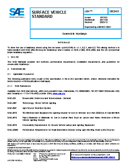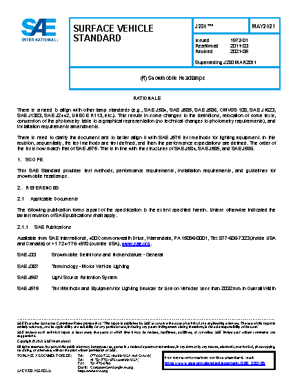 This SAE Standard provides test methods, performance requirements, installation requirements, and guidelines for snowmobile headlamps.